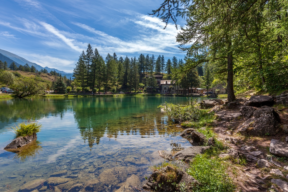 A pochi minuti dal borgo, si trova il Lago del Laux, un piccolo lago alpino che in inverno è un luogo di quiete assoluta, perfetto per una breve passeggiata sulla neve.