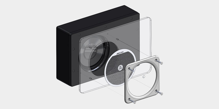 L’incassatura in legno ad alta densità e il piatto superiore in die-cast garantiscono un’installazione solida e durevole del woofer, mentre la griglia in acciaio spazzolato con logo Alpine aggiunge un tocco di stile. - Installazione Nascosta: