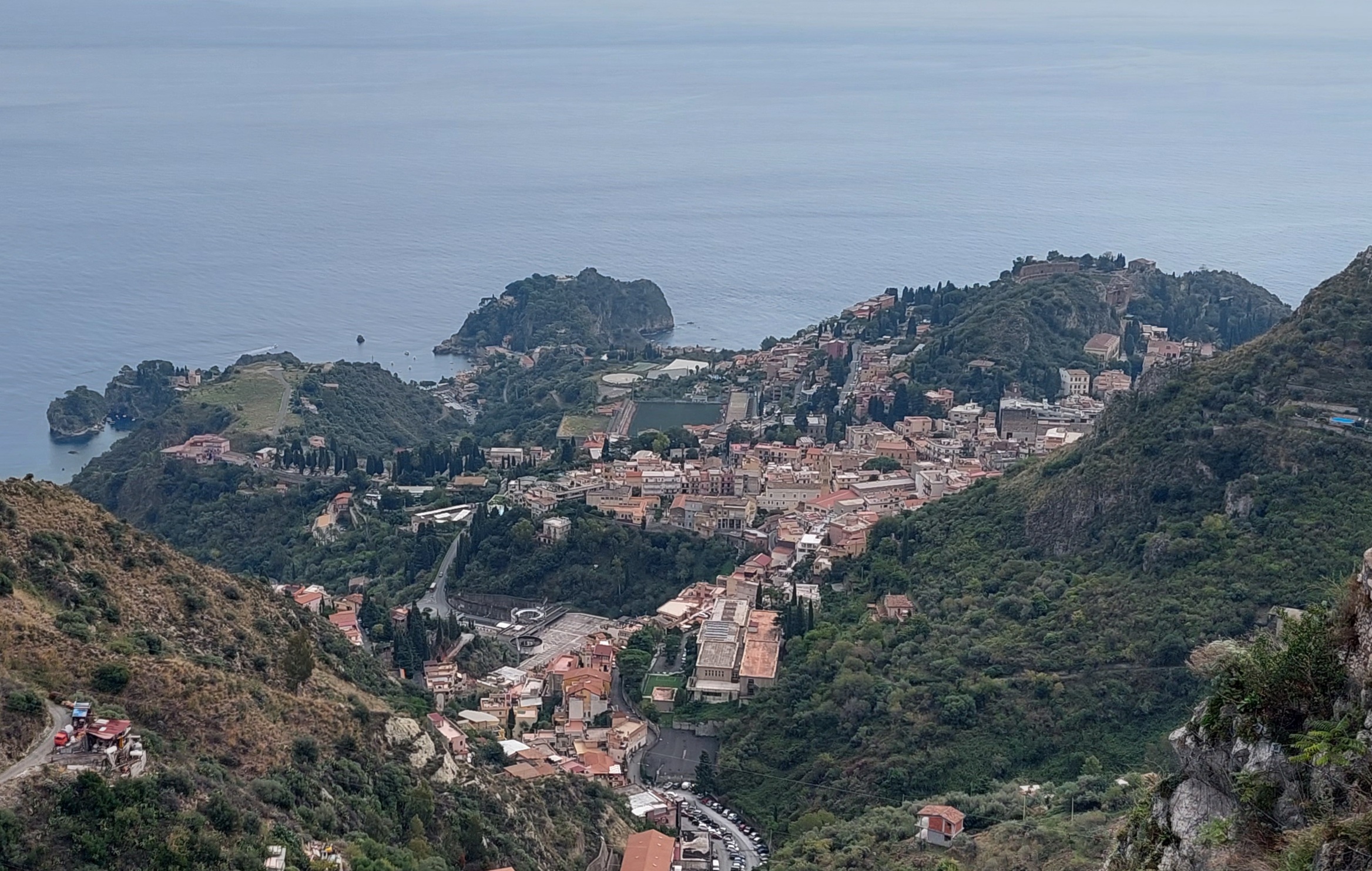Andiamo verso Taormina! Al mattino spostiamo il camper in un’ampia piazzola sempre all’interno dell’area camper Lagani a Giardini Naxos, con tanto lavandino, doccia fredda, tavolo, sedie e ombrellone. Ricordo che questa bell’area è convenzionata con Camperisti italiani. Poi andiamo alla fermata del bus e saliamo a Taormina (ci fanno pagare anche per Olly, che è dentro il suo trasportino). Arrivati a Taormina prendiamo il bus per Castelmola (9 euro tot a/r, 6 noi + 3 Olly). La strada si inerpica e gli autisti dei bus devono districarsi tra auto parcheggiate e tornanti effettuando manovre da veri esperti. Salendo appare sotto di noi l’Isola Bella.