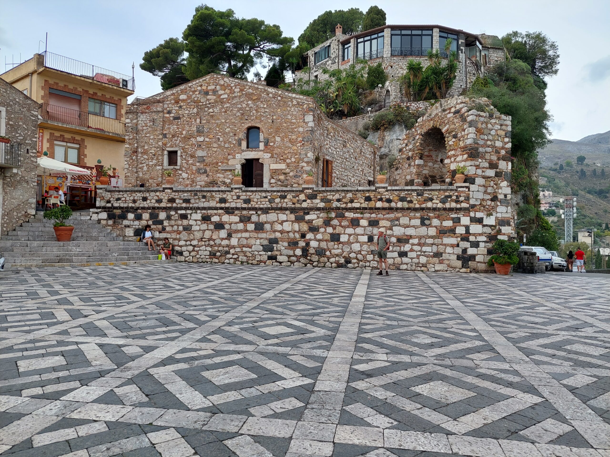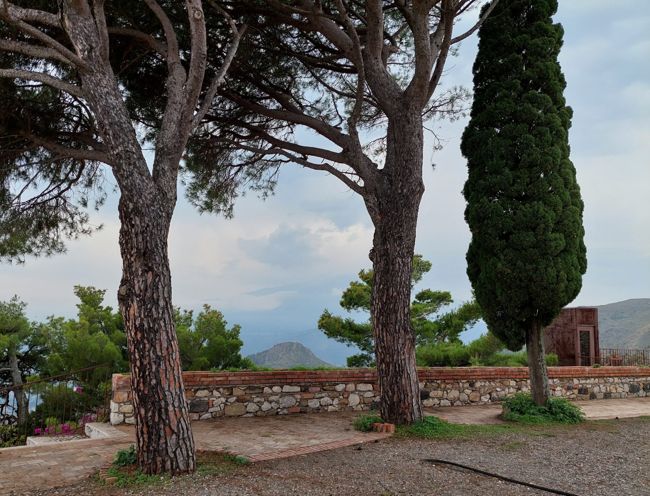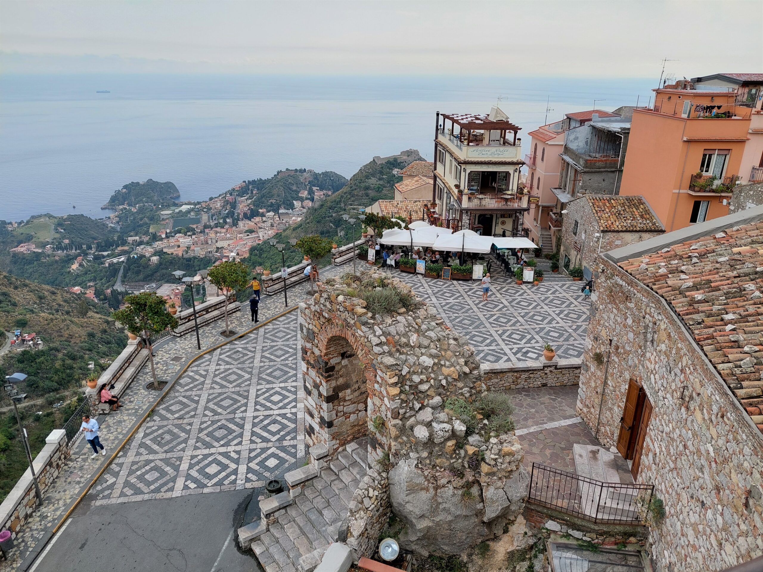 La vista spazia da Taormina (che è proprio lì sotto) al lungomare di Giardini Naxos (oggi è ancorata al largo una nave da crociera della MSC) fino all’Etna. Peccato che non sia una giornata limpida, il tempo è nuvoloso. Il borgo è piccolo, lo si gira in meno di un’ora.