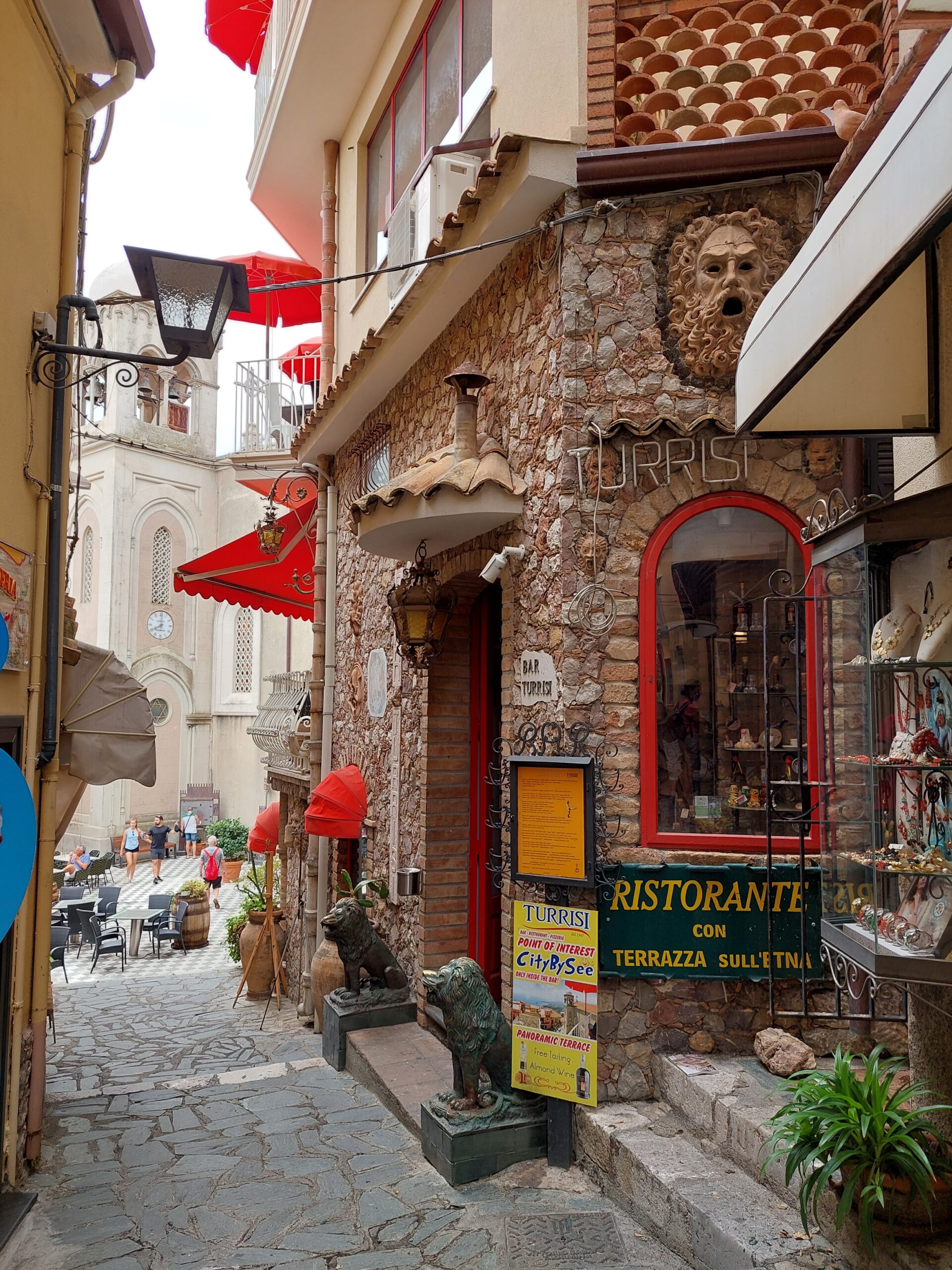 Curioso è il Bar Torrisi, conosciuto per la sua collezione di oggetti di forma fallica e sculture che rappresentano la virilità dell’uomo poi pranzo veloce con toast e bruschette e, alle 13,10, riprendiamo il bus per Taormina.