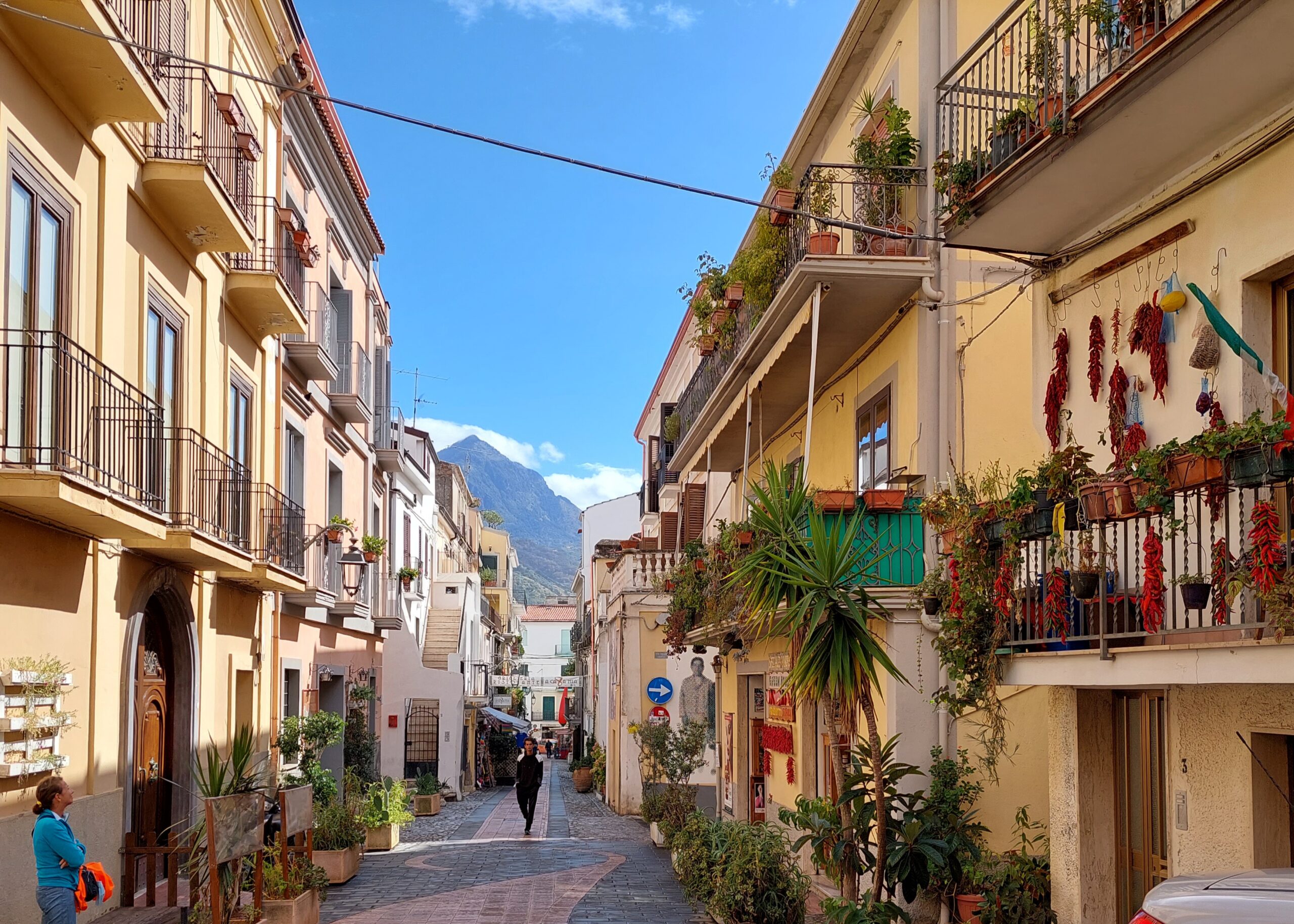 Ha piovuto tutto il giorno, con una pausa nel tardo pomeriggio, il mare è in burrasca. Al mattino andiamo in centro a Diamante. Si sta svolgendo il Peperoncino Fest ma non c’è in giro nessuno, pochi negozi aperti e la maggior parte delle bancarelle sono ancora chiuse. Forse è ancora presto o forse perché piove. La cittadina si anima un po’ dopo le 11,30.