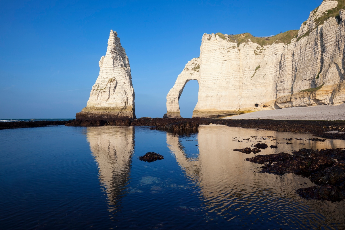 La più famosa e fotografata è la Falaise d’Aval, la scogliera bianca con l’arco che può sembrare una proboscide d’elefante protesa verso il mare, in contrasto con il blu del mare. Poco distante si trova l’Aiguille de la Falaise d’Aval: l’isolotto chiamato anche Ago che misura più di 55 metri d’altezza, e che, secondo Arsenio Lupin sarebbe cavo e conterrebbe un tesoro.