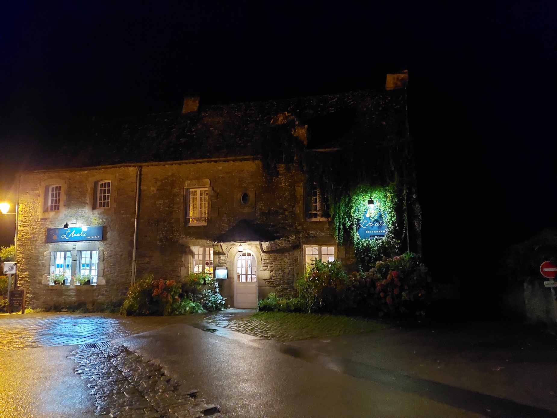 vedrete i tetti d’ardesia della case, la bella facciata della Mairie (Municipio) e proprio sotto di voi, l’Église Saint-Mélaine.