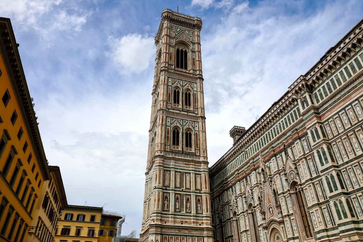 Progettato da Giotto di Bondone nel 1334, e terminato da Francesco Talenti, il Campanile del Giotto è un esempio straordinario di arte gotica fiorentina. Con i suoi 82 metri di altezza è uno dei punti più alti di Firenze ed è interamente decorato da marmi colorati con sculture e rilievi, che raffigurano scene bibliche, santi e profeti. Salire i 414 gradini fino alla cima offre una vista completa su Firenze e su monumenti come la Cupola di Brunelleschi, il Palazzo Vecchio e il Ponte Vecchio.