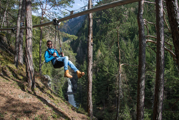 Arrivati alla terza cascata potete scegliere di tornare indietro dal sentiero dell’andata oppure optare per la Flyline: un percorso immerso nel bosco che vi permette di scendere appesi ad un binario con imbragatura di sicurezza.