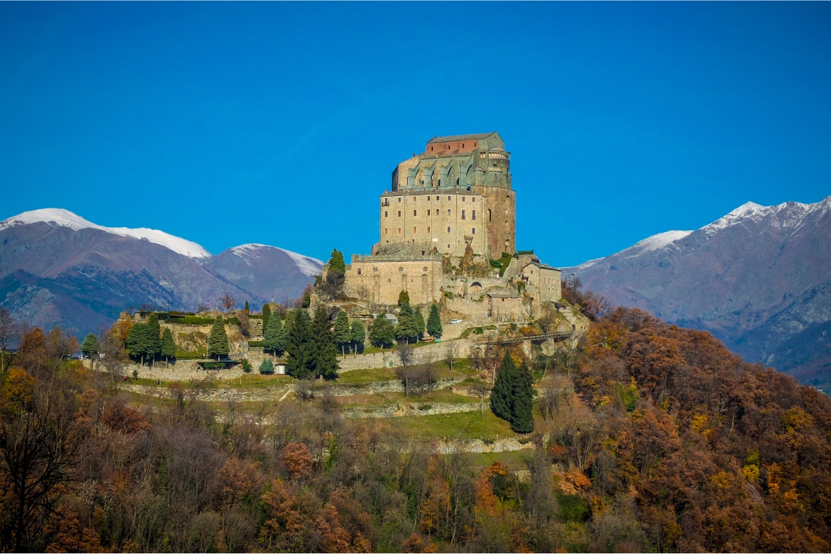 Con la sua sagoma imponente, l’Abbazia della Sacra di San Michele sembra quasi che voglia toccare il cielo, ergendosi maestosa verso l’azzurro, sulla cima del Monte Pirchiriano, a 962 metri di altitudine.