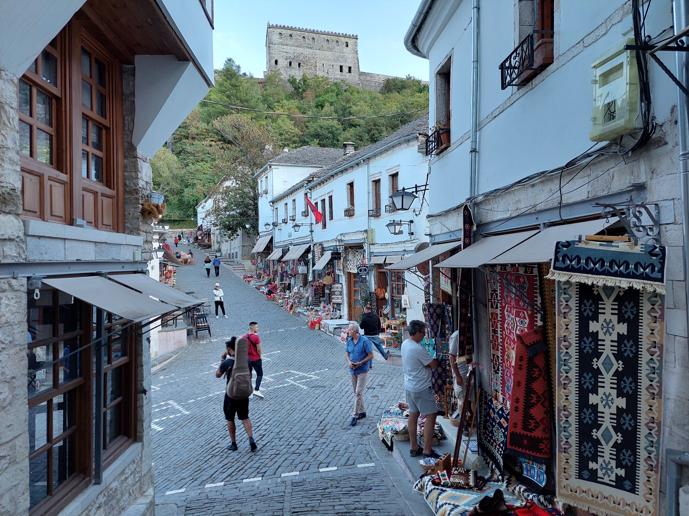 Gjirokaster fa parte della Lista del Patrimonio Mondiale dell’UNESCO. Bianche case basse e vie di ciottoli, stile ottomano, un insieme davvero pittoresco. Negozi di souvenir e tanti ristoranti. Poi iniziamo la lunga discesa verso la parte nuova della città che si trova, appunto nella parte più bassa. Usciti dalla zona chiamata Bazaar, le case e le vie continuano ad essere uguali a quelle del Bazaar, ma non ci sono più negozi nè ristoranti. Molte case sono disabitate, alcune le stanno recuperando.