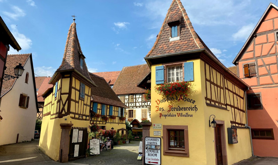 Riquewihr, uno dei borghi più fotografati della regione, incanta con le sue vie acciottolate, le botteghe artigiane e le case a graticcio.