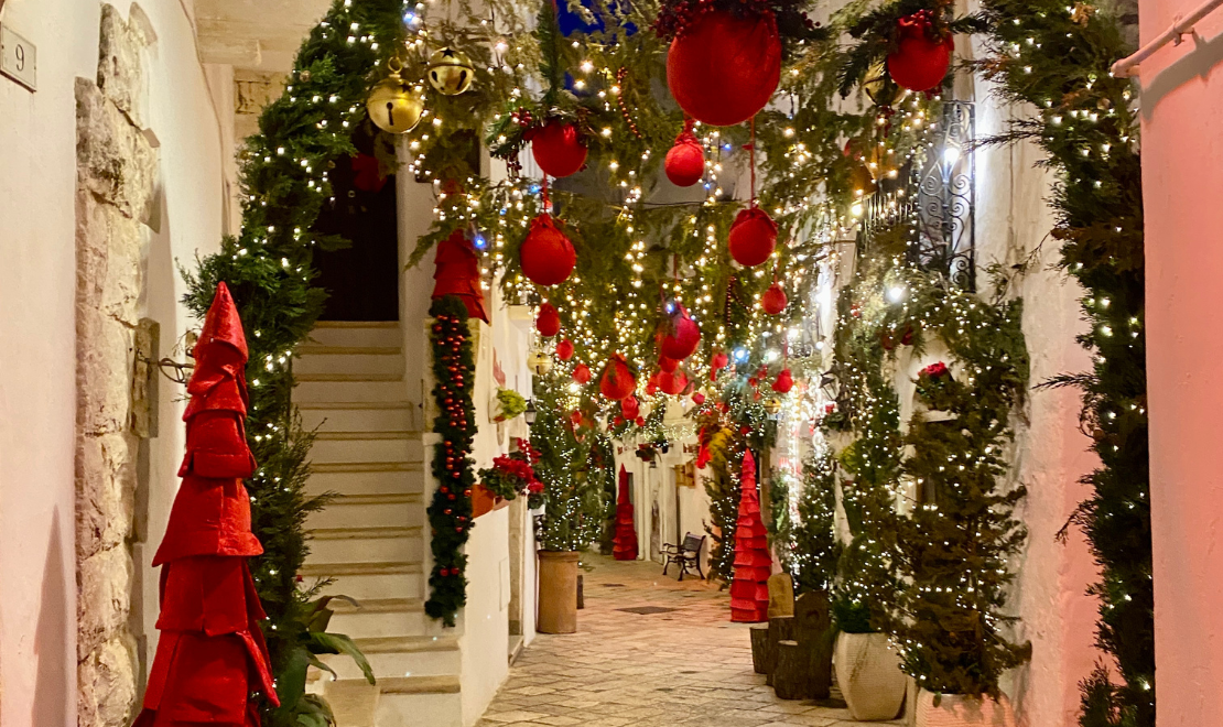 Arrivo a Locorotondo e visita del borgo e dei mercatini natalizi. Qui il centro storico, già incantevole con le tipiche cummerse, si trasforma in un vero villaggio da fiaba: vicoli addobbati con ghirlande e luminarie artistiche, archi di luci che creano un cielo stellato sopra le stradine, balconi decorati e presepi allestiti davanti alle case. I mercatini offrono prodotti tipici pugliesi, dolci tradizionali come cartellate e pettole, artigianato locale e ceramiche natalizie. Un’atmosfera unica che renderà la visita indimenticabile.